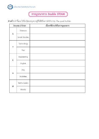 276 โรงเรียนสาธิตมหาวิทยาลัยศรีนครินทรวิโรฒ ปทุมวัน การบูรณาการ Double STEAM ส่วนที่ 3 ค�าชี้แจง ให้นักเรียนระบุความรู้ที่ได้ใช้ในการท�ากิจกรรม The great builder