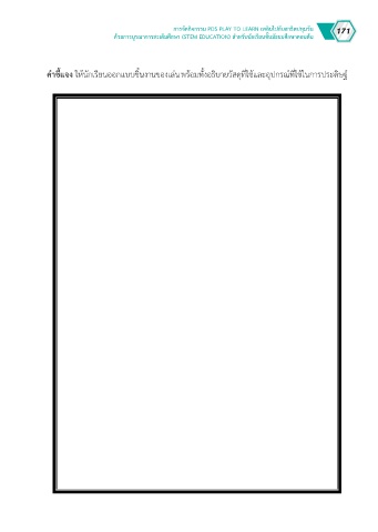 การจัดกิจกรรม PDS PLAY TO LEARN เพลินไปกับสาธิตปทุมวัน 171 ด้วยการบูรณาการสะเต็มศึกษา (STEM EDUCATION) ส�าหรับนักเรียนชั้นมัธยมศึกษาตอนต้น ค�าชี้แจง ให้นักเรียนออกแบบชิ้นงานของเล่น พร้อมทั้งอธิบายวัสดุที่ใช้และอุปกรณ์ที่ใช้ในการประดิษฐ์