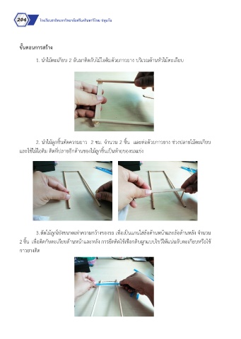 2. น�าไม้ลูกชิ้นตัดความยาว 2 ซม. จ�านวน 2 ชิ้น และต่อด้วยกาวยาง ช่วงปลายไม้ตะเกียบ