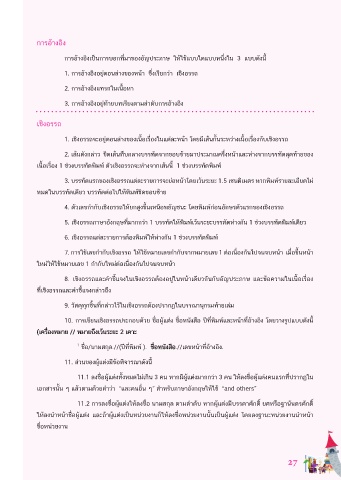 10. การเขียนเชิงอรรถประกอบดวย ชื่อผูแตง ชื่อหนังสือ ปีที่พิมพและหนาที่อางอิง โดยวางรูปแบบดังนี้
