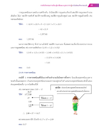 และการคูณทศนิยม เช่น จงหาผลลัพธ์ของ (-2.45 + 1.2) x (-4.52)