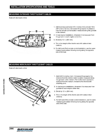 INSTALLATION SPECIFICATIONS AND TOOLS MEASURING OUTBOARD THROTTLE/SHIFT CABLES Boats with side mount controls. MEASURING MERCRUISER THROTTLE/SHIFT CABLES Boats with side mount controls. QUICKSILVER® RIGGING 266