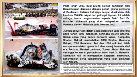Boulevard, Putrajaya pada 31 Ogos 2003. Kereta berhias ini adalah simbolik kepada kejayaan peningkatan penyertaan