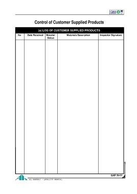 Control of Customer Supplied Products (a) LOG OF CUSTEMER SUPPLIED PRODUCTS No Date Received Material Materials Description Inspector Signature Status QAP 70-01 82 AL HABBAI - QUALITY MANUAL