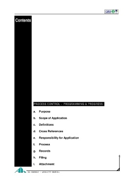 Contents PROCESS CONTROL - PROGRAMMING & PROGRESS a. Purpose b. Scope of Application c. Definitions d. Cross References e. Responsibility for Application f. Process g. Records h. Filing i. Attachment 90 AL HABBAI - QUALITY MANUAL