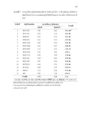 ตารางที่ 7 ขนาดของไส้กลางพันธุ์/โคลนอ้อยทแตกตางกันทอายุเก็บเกี่ยว 12 เดือนหลังปลูก เมื่อได้รับการ