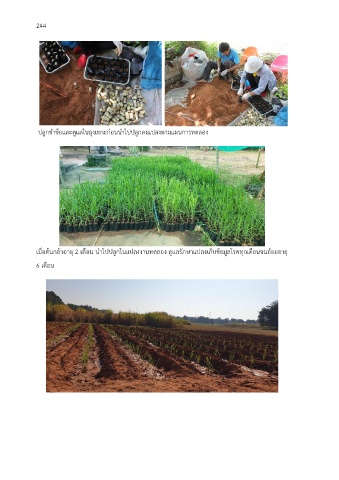 244 ปลูกช าข้อและดูแลในถุงเพาะก่อนน าไปปลูกลงแปลงตามแผนการทดลอง ู ื ื ุ ู เมื่อตนกลาอายุ 2 เดอน น าไปปลกในแปลงงานทดลอง ดแลรักษาแปลงเก็บข้อมูลโรคทกเดอนจนอ้อยอายุ ้ ้ 6 เดือน