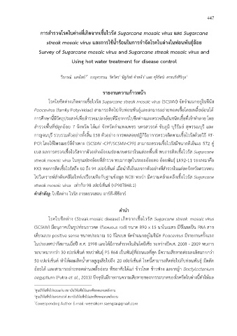 การศกษานี้มีวัตถุประสงคเพื่อสารวจแปลงอ้อยที่มีอาการใบขีดดางและตรวจยืนยันชนิดเชอทเข้าทาลาย โดย