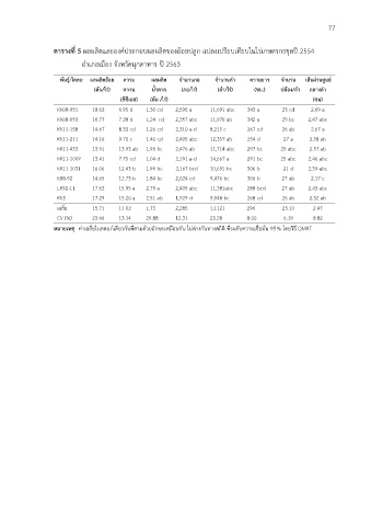 หมายเหต ค่าเฉลี่ยในสดมภ์เดียวกันที่ตามด้วยอักษรเหมือนกัน ไม่ต่างกันทางสถิติ ที่ระดับความเชื่อมั่น 95% โดยวิธี DMRT