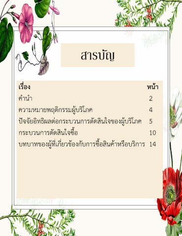 สำรบัญ เรื่อง หน้า ค ำน ำ 2 ควำมหมำยพฤติกรรมผู้บริโภค 4 ปัจจัยอิทธิผลต่อกระบวนกำรตัดสินใจของผู้บริโภค 5 กระบวนกำรตัดสินใจซื้อ 10 บทบำทของผู้ที่เกี่ยวข้องกับกำรซื้อสินค้ำหรือบริกำร 14 3