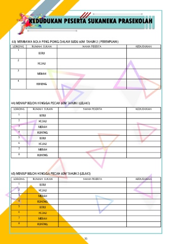 43) MEMBAWA BOLA PING PONG DALAM SUDU 60M TAHUN 2 ( PEREMPUAN )