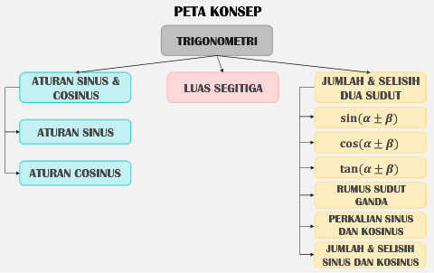 PETA KONSEP TRIGONOMETRI ATURAN SINUS & LUAS SEGITIGA JUMLAH & SELISIH COSINUS DUA SUDUT ( ± ) ATURAN SINUS ( ± ) ( ± ) ATURAN COSINUS RUMUS SUDUT GANDA PERKALIAN SINUS DAN KOSINUS JUMLAH & SELISIH SINUS DAN KOSINUS