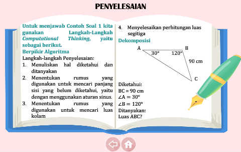 CONTOH SOAL 1 Di dalam lingkungan pesantren terdapat sepetak tanah yang rencananya akan dibangun kolam berbentuk segitiga dengan sketsa sebagai berikut. 30° 120° 90 cm Hitunglah berapa luas kolam di pesantren itu!
