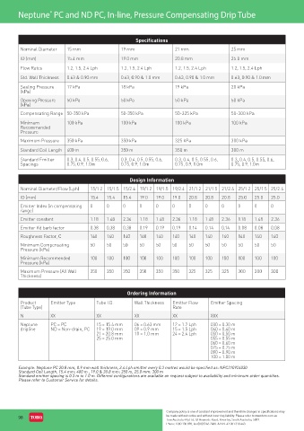 Example: Neptune PC 20.8 mm, 0.9 mm wall thickness, 2.4 Lph emitter every 0.3 metres would be specified as: NPC210924030