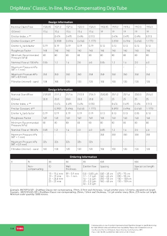 Example: XN190916100 – DripMaxx Classic non-compensating, 19mm, 0.9mm wall thickness, 1.6 Lph emitter every 1.0 metre, standard coil length.