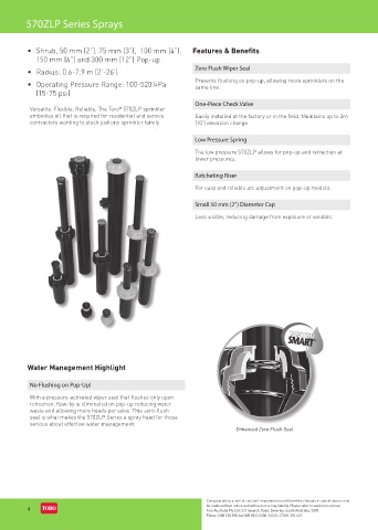 • Operating Pressure Range: 100-520 kPa Prevents flushing on pop-up, allowing more sprinklers on the