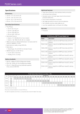 • Electric: 140-1500 kPa (50, 80 mm models) P220-23-54 Electric, In-Line 25 mm BSP Plastic Valve, 24V 50 Hz