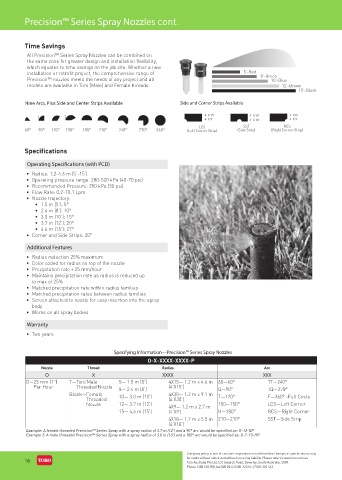 Example: A female threaded Precision™ Series Spray with a spray radius of 3.7 m (12’) and a 90° arc would be specified as: O-12-QP
