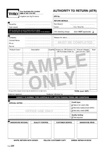 SUBJECT TO NORMAL TORO AUSTRALIA PTY LIMITED TRADING TERMS AND CONDITIONS