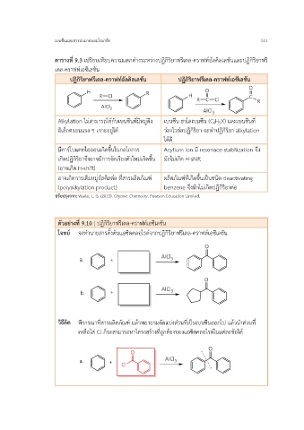ตารางที่ 9.3 เปรียบเทียบความแตกต่างระหว่างปฏิกิริยาฟรีเดล-คราฟท์อัลคิลเลชันและปฏิกิริยาฟรี