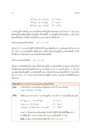 วิธีคิด ให้พิจารณาจากตารางค่า E◦ ของครึ่งปฏิกิริยา (ตารางที่ 4.2) ของสารที่เกี่ยวข้องจะได้