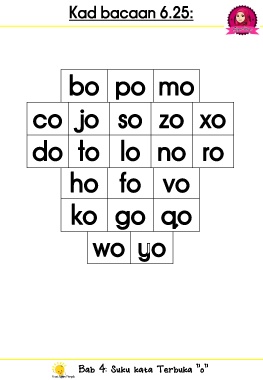 Kad bacaan 6.25: bo po mo co jo so zo xo do to lo no ro ho fo vo ko go qo wo yo Bab 4: Suku kata Terbuka “o”