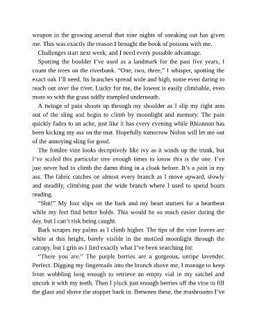 “Shit!” My foot slips on the bark and my heart stutters for a heartbeat