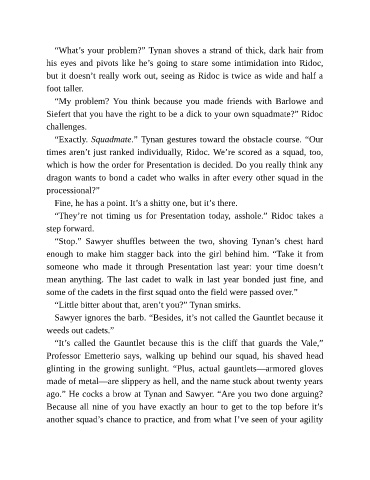 “Exactly. Squadmate.” Tynan gestures toward the obstacle course. “Our