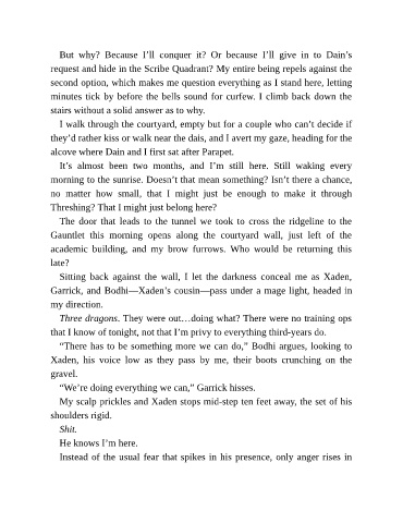 Xaden, his voice low as they pass by me, their boots crunching on the