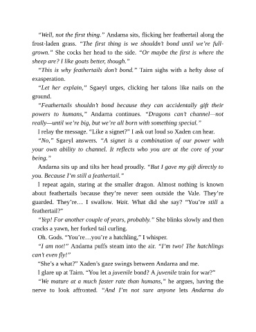“I am not!” Andarna puffs steam into the air. “I’m two! The hatchlings