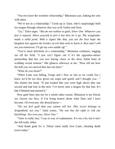 “Go,” Tairn urges. “But do not wallow in guilt, Silver One. Whatever you
