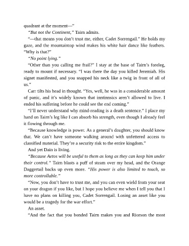“—that means you don’t trust me, either, Cadet Sorrengail.” He holds my