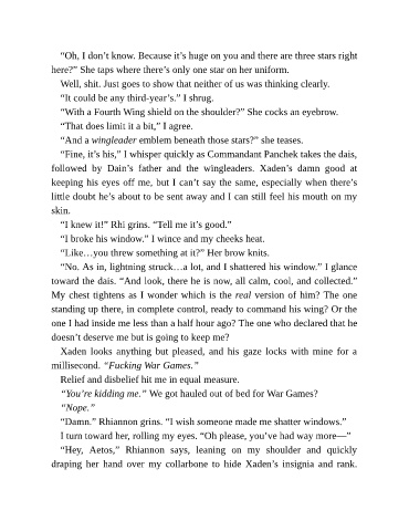 draping her hand over my collarbone to hide Xaden’s insignia and rank.