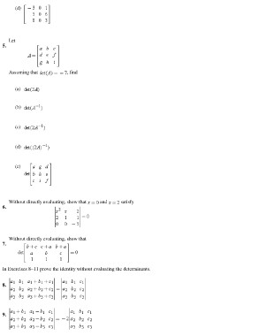 (d) Let , find 5. Assuming that (a) (b) (c) (d) (e) Without directly evaluating, show that and satisfy 6. Without directly evaluating, show that 7. In Exercises 8–11 prove the identity without evaluating the determinants. 8. 9.