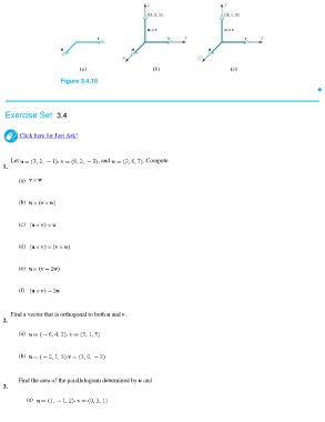 Figure 3.4.10 Exercise Set 3.4 Click here for Just Ask! Let , , and . Compute 1. (a) (b) (c) (d) (e) (f) Find a vector that is orthogonal to both u and v. 2. (a) , (b) , Find the area of the parallelogram determined by u and 3. (a) ,