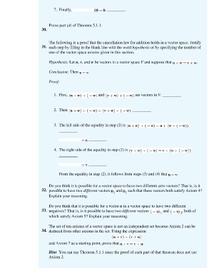 The following is a proof that the cancellation law for addition holds in a vector space. Justify