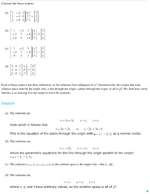 Each of these systems has three unknowns, so the solutions form subspaces of . Geometrically, this means that each