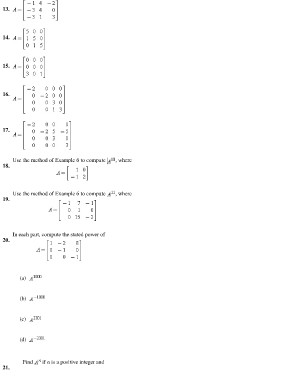 13. 14. 15. 16. 17. Use the method of Example 6 to compute , where 18. Use the method of Example 6 to compute , where 19. In each part, compute the stated power of 20. (a) (b) (c) (d) Find if n is a positive integer and 21.