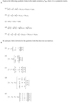 Express the following quadratic forms in the matrix notation , where A is a symmetric matrix. 3. (a) (b) (c) (d) (e) In each part, find a formula for the quadratic form that does not use matrices. 4. (a) (b) (c) (d) (e)