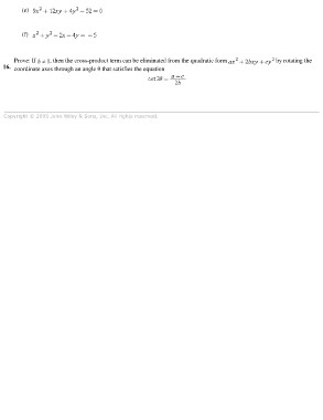 (e) by rotating the (f) Prove: If , then the cross-product term can be eliminated from the quadratic form 16. coordinate axes through an angle θ that satisfies the equation Copyright © 2005 John Wiley & Sons, Inc. All rights reserved.