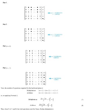 Step 1. (7) (8) Step 2. Step . Step . Thus, the number of operations required for the backward phase is or, on applying Formula 3, Thus, from 5, 6, 7, and 8, the total operation count for Gauss–Jordan elimination is