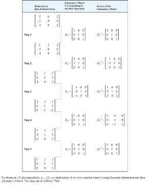 To obtain an -decomposition, , we shall reduce A to a row-echelon form U using Gaussian elimination and then calculate L from 8. The steps are as follows: Thus