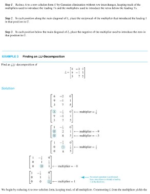 Step 3. In each position below the main diagonal of L, place the negative of the multiplier used to introduce the zero in