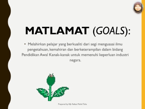 MATLAMAT (GOALS): • Melahirkan pelajar yang berkualiti dari segi menguasai ilmu pengetahuan, kemahiran dan berketerampilan dalam bidang Pendidikan Awal Kanak-kanak untuk memenuhi keperluan industri negara. Prepared by Hjh Rehan Mohd Taha
