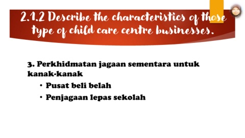 2.1.2 Describe the characteristics of those type of child care centre businesses. 3. Perkhidmatan jagaan sementara untuk kanak-kanak • Pusat beli belah • Penjagaan lepas sekolah