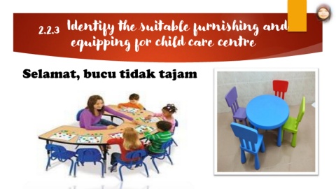 Identify the suitable furnishing and 2.2.3 equipping for child care centre Selamat, bucu tidak tajam