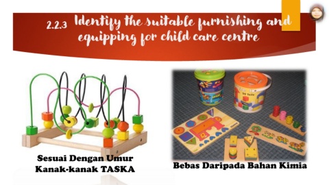 Identify the suitable furnishing and 2.2.3 equipping for child care centre Sesuai Dengan Umur Kanak-kanak TASKA Bebas Daripada Bahan Kimia