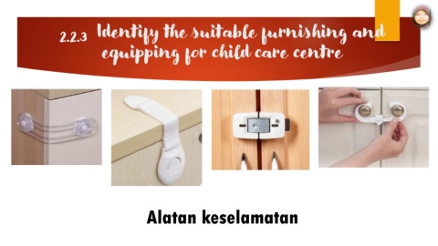 Identify the suitable furnishing and 2.2.3 equipping for child care centre Alatan keselamatan