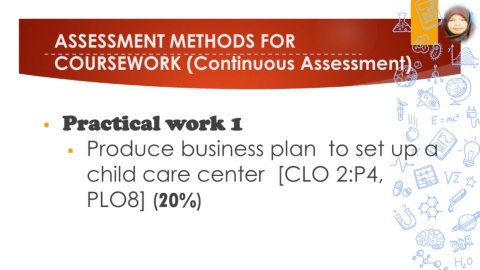 ASSESSMENT METHODS FOR COURSEWORK (Continuous Assessment) ▪ Practical work 1 ▪ Produce business plan to set up a child care center [CLO 2:P4, PLO8] (20%) 44