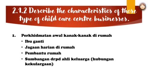2.1.2 Describe the characteristics of those type of child care centre businesses. 1. Perkhidmatan awal kanak-kanak di rumah • Ibu ganti • Jagaan harian di rumah • Pembantu rumah • Sumbangan drpd ahli keluarga (hubungan kekulargaan)
